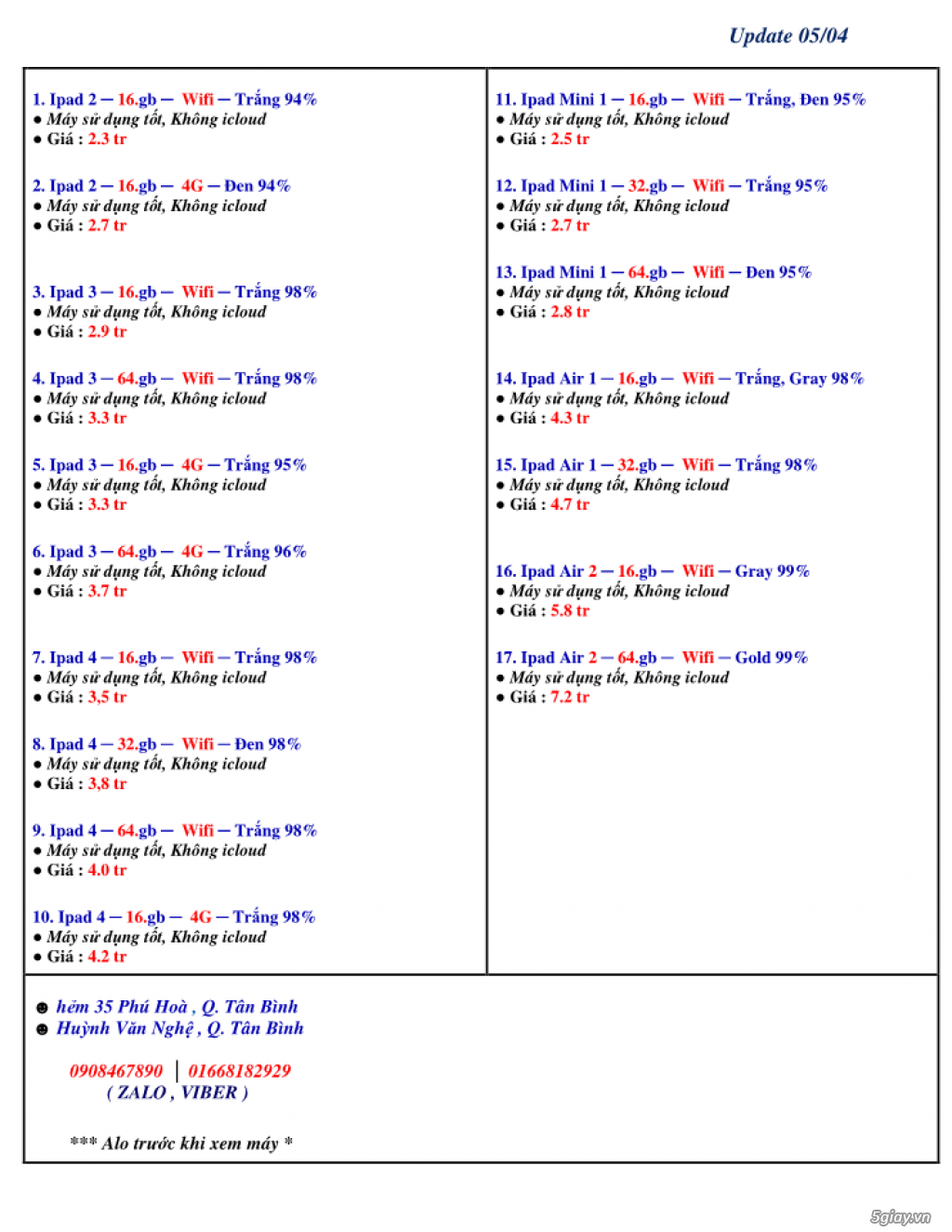 Ipad 2, 3, 4 - Mini 1, 2, 3 - Air 1, 2, 3 __ Máy mới >98% ,